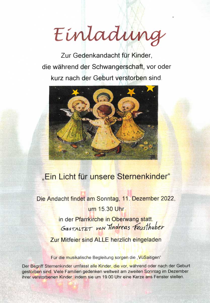 In Oberwang wird am Sternenkinder-Tag eine kleinen Andacht gestaltet. Diese findet extra am Nachmittag (um 15:30) statt, damit alle Familien (Eltern, Kinder, Geschwister, ..) gemeinsam ihrer Sternenkinder gedenken können. Zusammen wird in der Oberwanger Pfarrkirche gebetet, gesungen und natürlich auch eine Kerze für jedes verstorbene Kind entzündet.