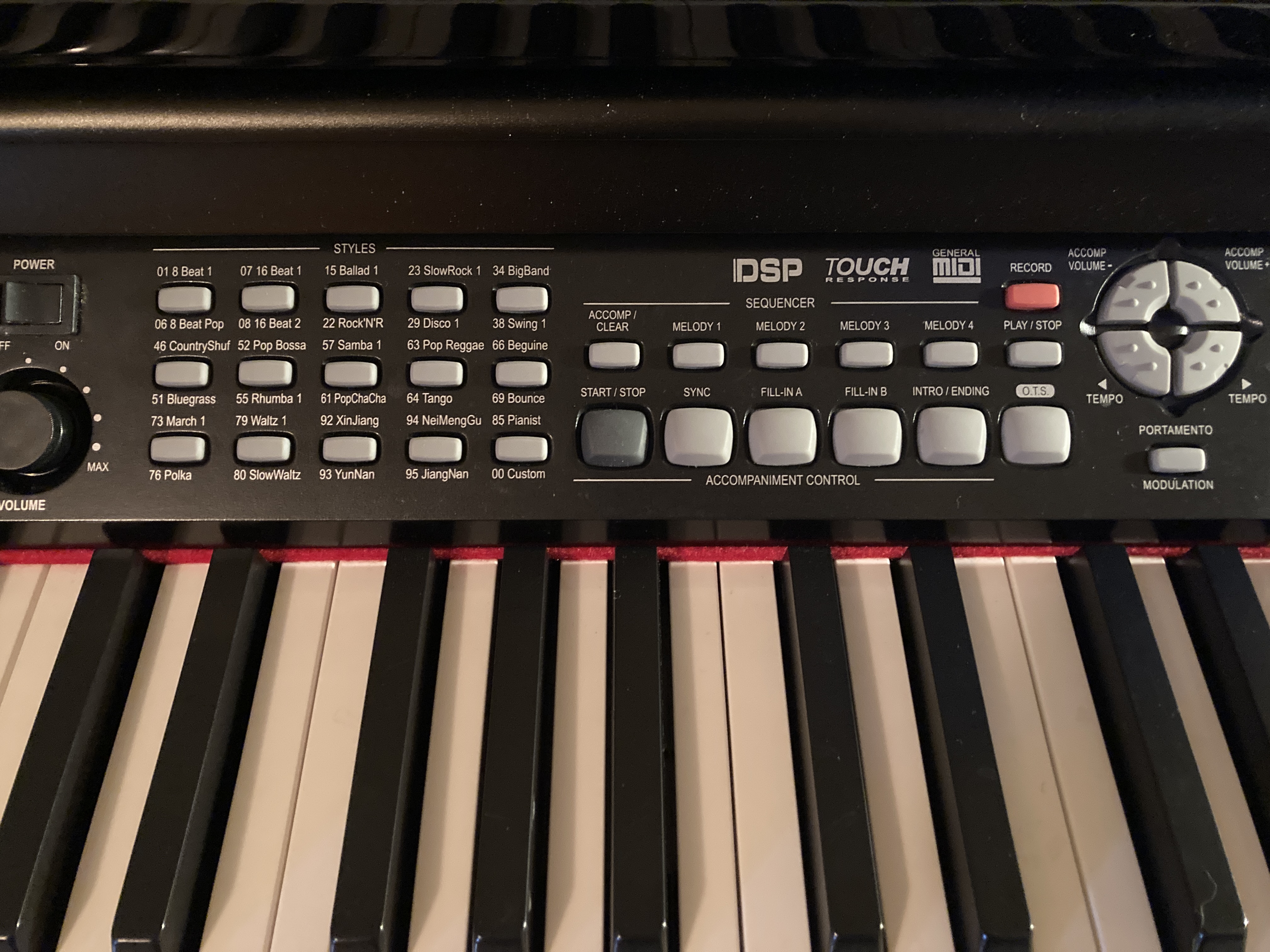 Es hat 3 Fußpedale, Kopfhöhreranschluß, LCD-Display und kann mit Aktiv-Boxen oder einem externen Verstärker verbunden werden.