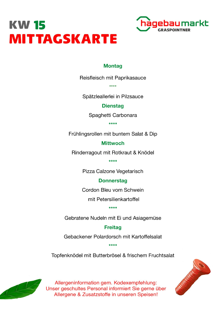 Das cafebistro hagebau-Team bietet dir die Lösung! Täglich kann zwischen zwei Mittagsmenüs ausgewählt werden.