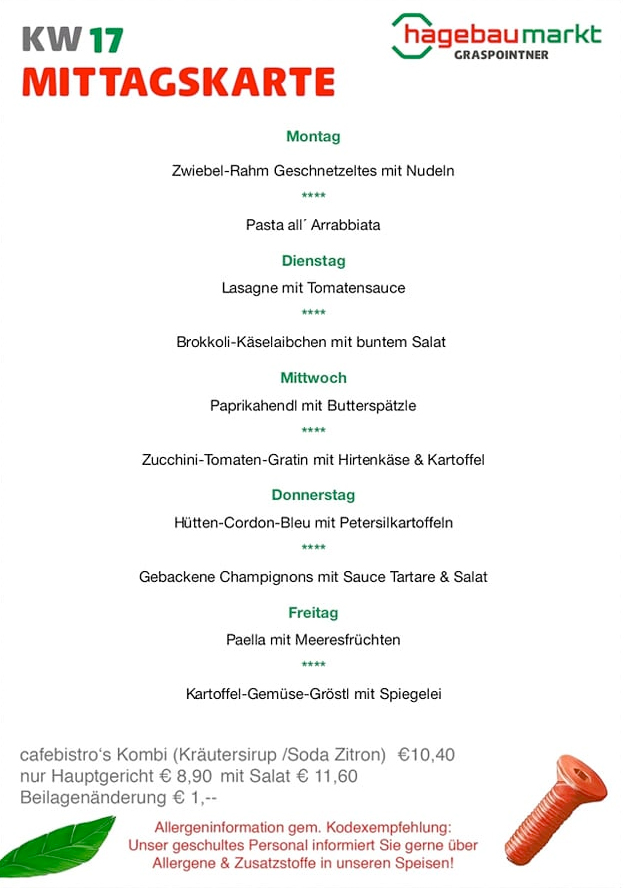 Das cafebistro hagebau-Team bietet dir die Lösung! Täglich kann zwischen zwei Mittagsmenüs ausgewählt werden.