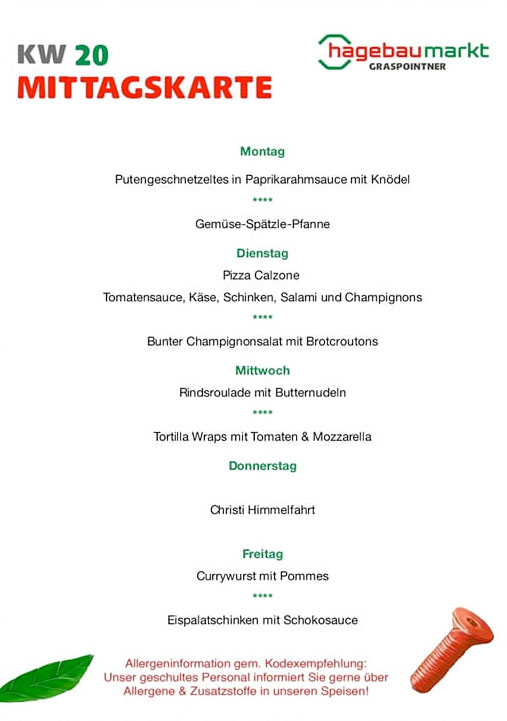 Das cafebistro hagebau-Team bietet dir die Lösung! Täglich kann zwischen zwei Mittagsmenüs ausgewählt werden.