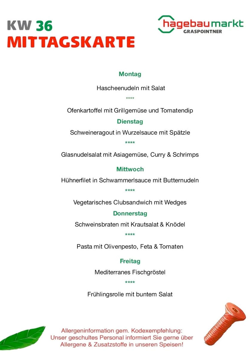 Das cafebistro hagebau-Team bietet dir die Lösung! Täglich kann zwischen zwei Mittagsmenüs ausgewählt werden.