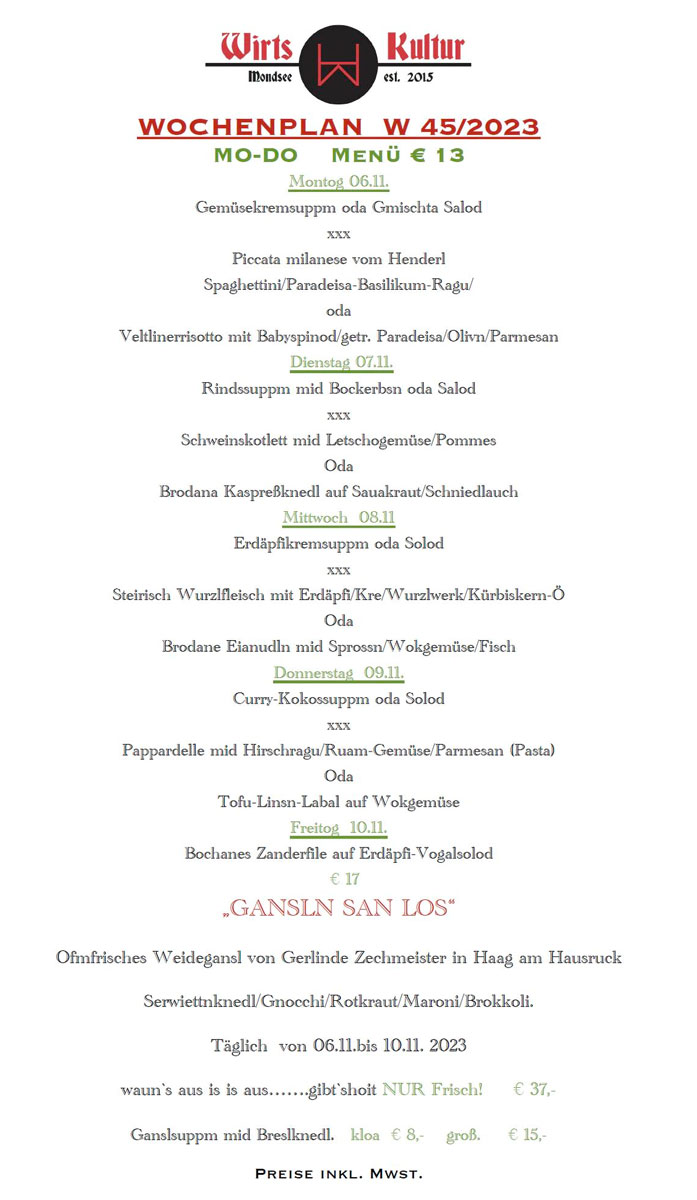 Unser kulinarischer Wochenplan für KW 45/23 in der Wirtskultur Mondsee