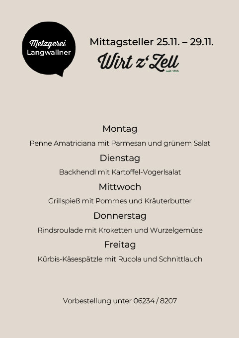 Unseren Mittagsteller gibt es zum Abholen schon wieder ab dem 25.11. in der Metzgerei.