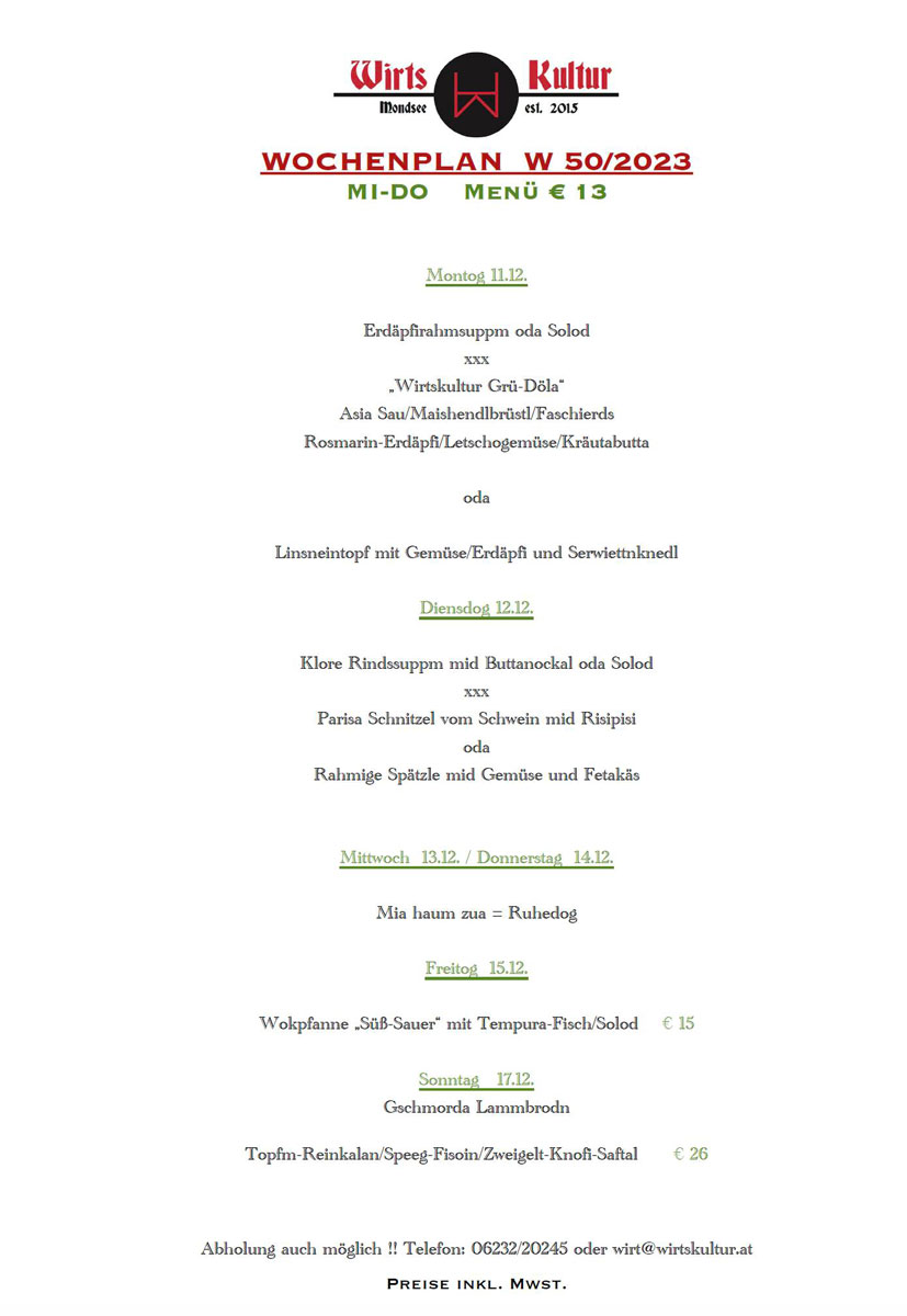 Unser kulinarischer Wochenplan für KW 50/23 in der Wirtskultur Mondsee